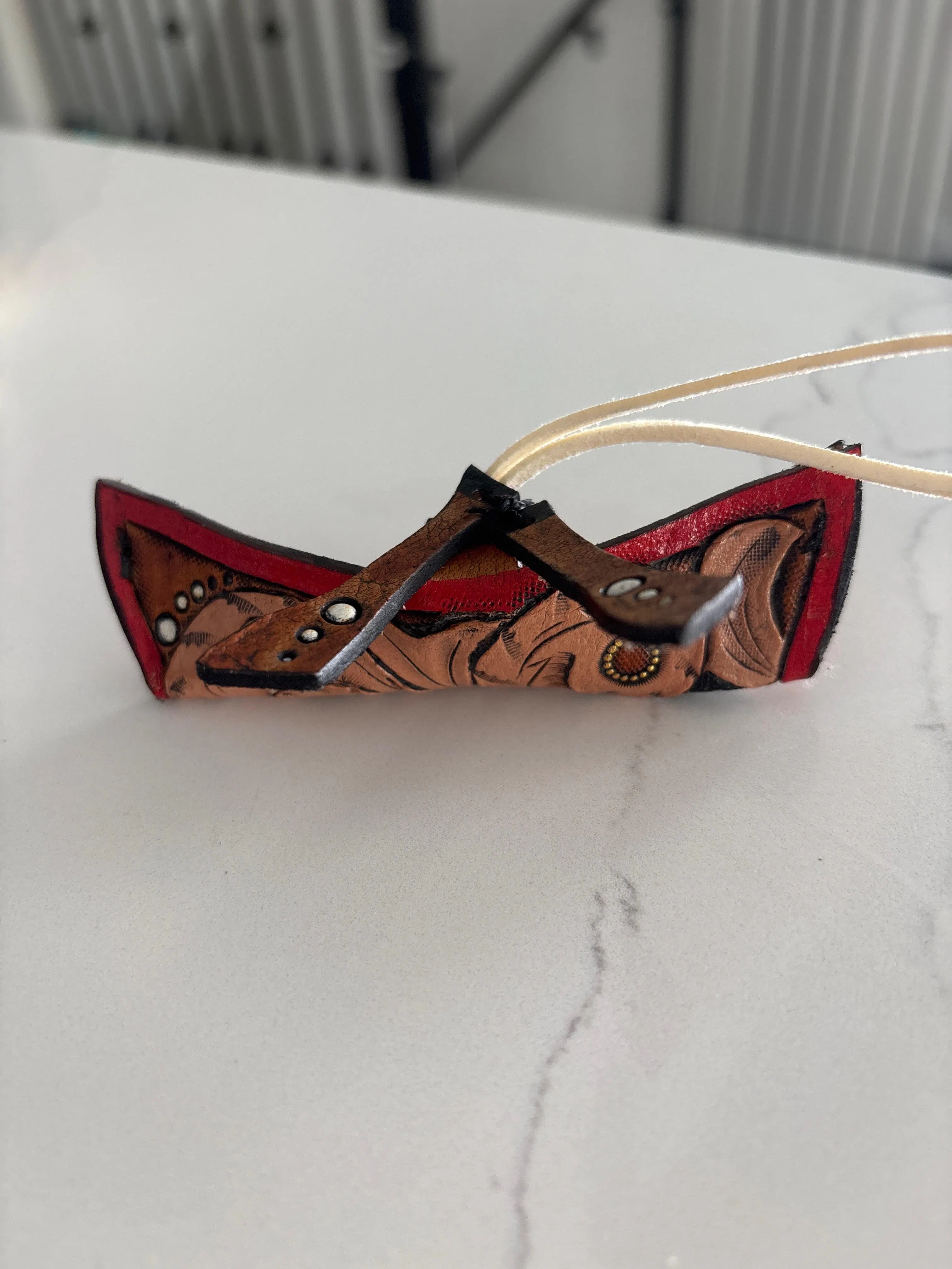 This canoe is made from veg tanned leather and is hand tooled with scrolls, white dots, red trim and is then wet molded into a canoe with paddles.